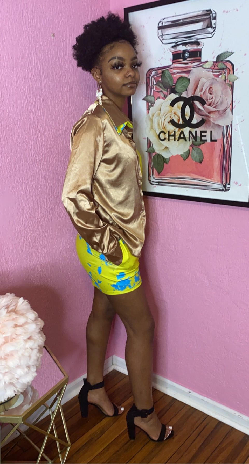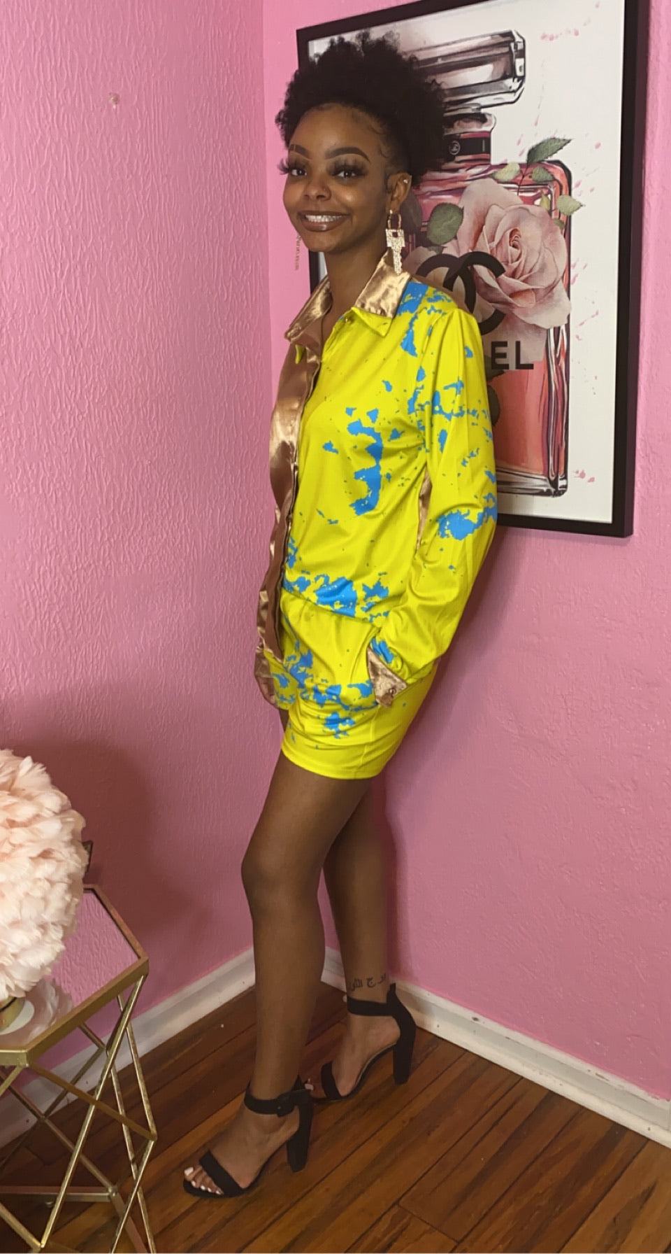 This two-piece statement set features a satin-finish gold blouse paired with vibrant neon shorts accented in artistic blue splatter detailing. The mixed-texture contrast elevates the look from casual to couture-inspired cool.