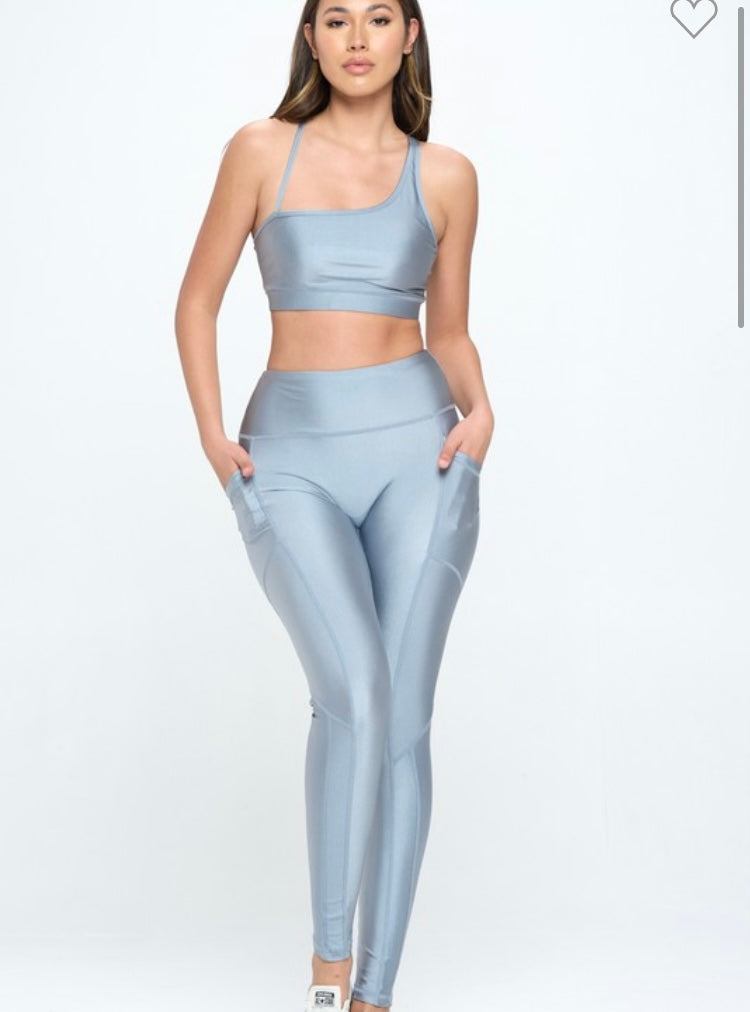 This two-piece performance set was designed to sculpt, support, and move with you. Featuring a smooth square-neck sports bra with delicate crisscross back straps and high-waisted leggings with functional side pockets, this set blends feminine structure with everyday performance.