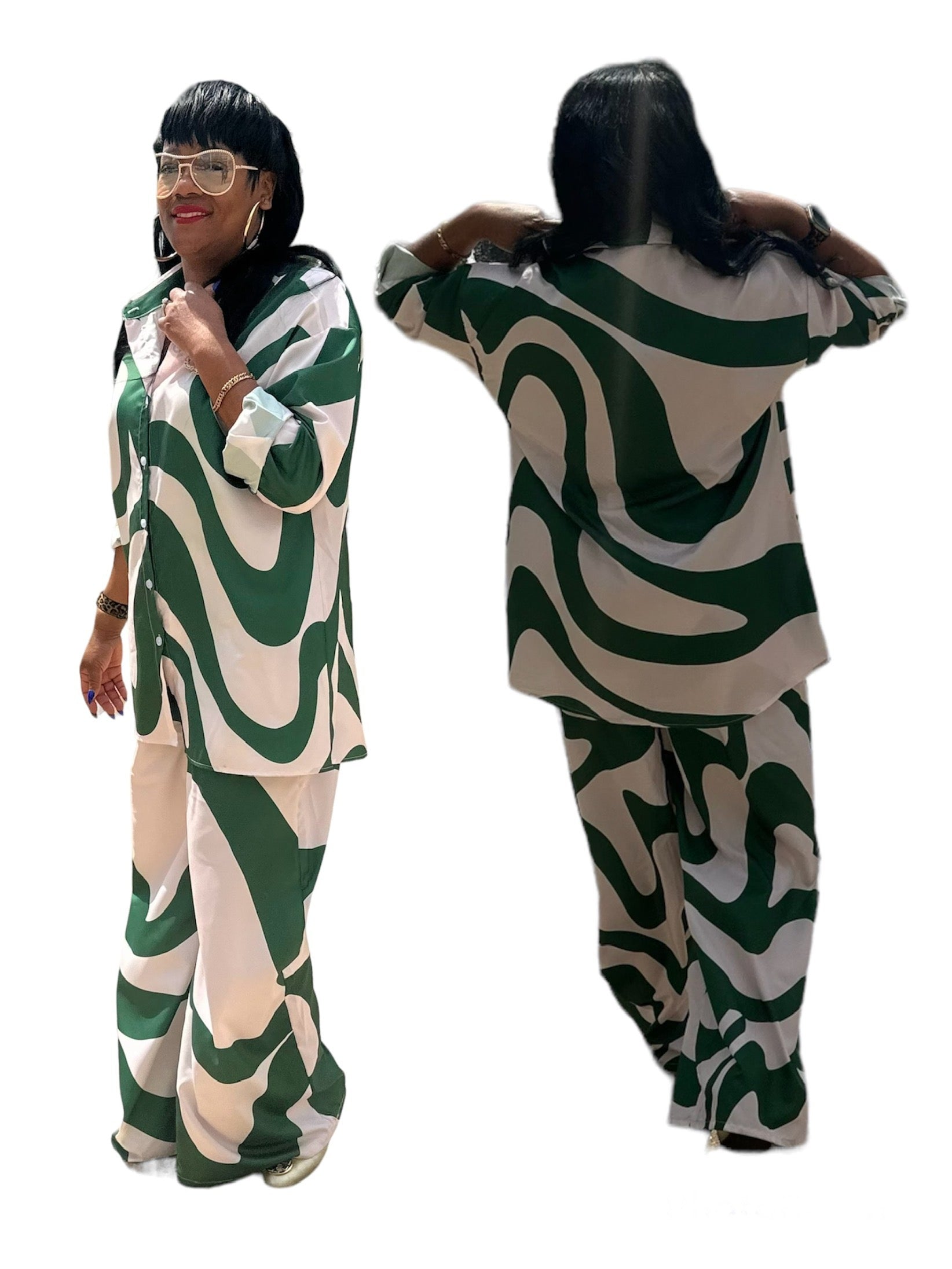 This statement green and cream abstract two-piece set blends comfort with undeniable presence. Featuring a relaxed button-down tunic top and flowy wide-leg pants, this set delivers movement, ease, and high-fashion energy in one effortless look.